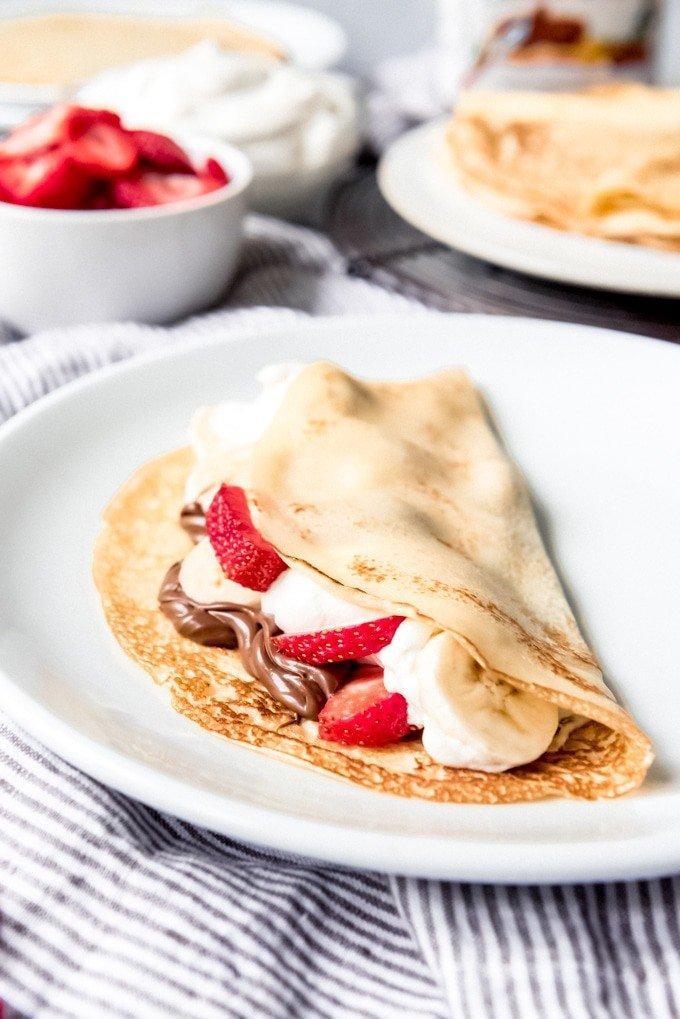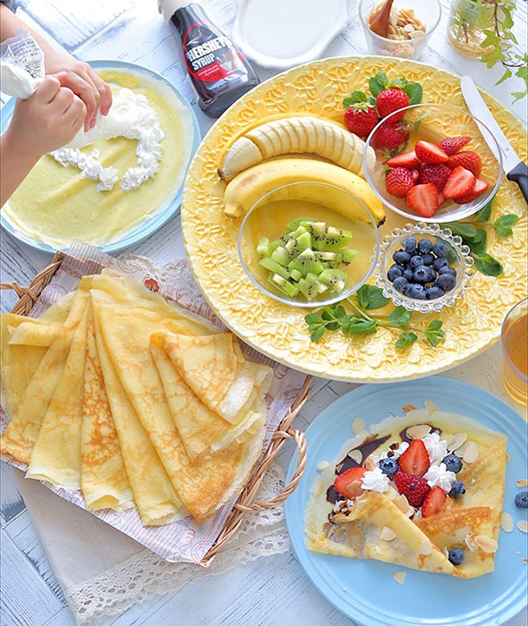 - Sau khi đã hoàn thành xong vỏ bánh, các bạn có thể dùng bánh Crepe với bất cứ nguyên liệu yêu thích nào: từ trái cây, mứt hoa quả, kem tươi, chocolate, mật ong hay dăm bông, thịt nguội… Các bạn chỉ việc gập bánh Crepe lại, trang trí theo ý thích hoặc cho nguyên liệu ăn kèm.