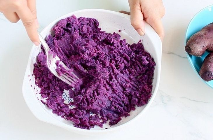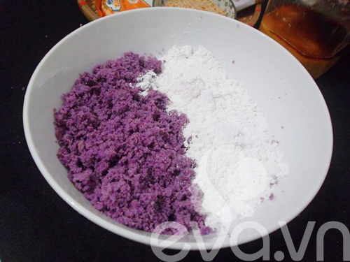 Bước 3: Để khoai lang tím và vàng đã hấp chín ra 2 cái tô, dùng thìa to nghiền nhuyễn. Tiếp đến, cho thêm 100g bột năng vào từng loại khoai, dùng thìa đảo trộn đều rồi tiến hành nhào bột và tạo hình thành những viên nhỏ vừa ăn. Trong quá trình nhào bột, nếu thấy bột khô có thể cho thêm nước nhưng lưu ý là cho từng thìa cà phê 5ml một tránh tình trạng cho thêm nhiều nước quá bột bị nhão.