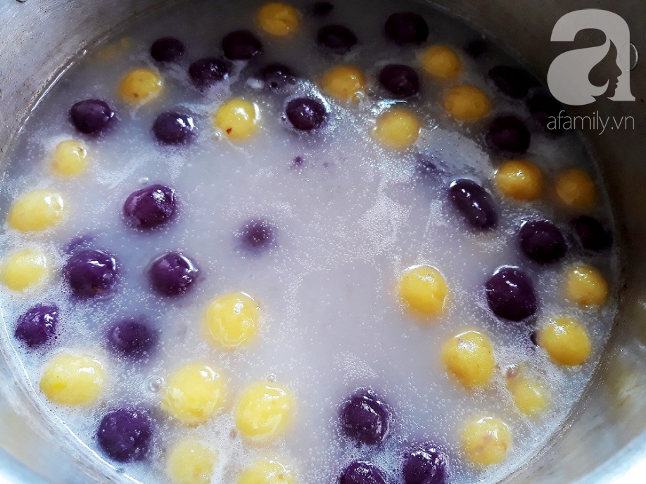 Bước 4: Đặt nồi nước lên bếp đun đến khi nước sôi thì thả các viên bột khoai vào luộc. Những viên khoai dẻo chín sẽ nổi lên trên bề mặt nước. Để các viên khoai không bị dính vào nhau, cần chuẩn bị trước một bát tô nước lọc có thả thêm vài viên đá lạnh để khi khoai dẻo chín thì dùng muôi thủng vớt ra thả vào bát nước.
