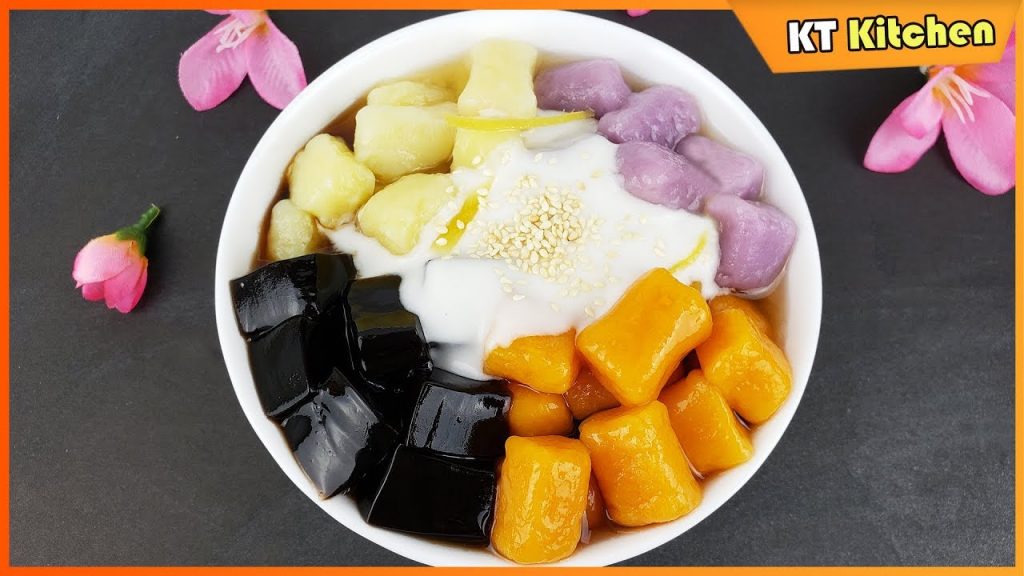 Bước 7: Múc thạch đen sương sáo, khoai lang dẻo tím, khoai lang dẻo vàng ra bát sau đó rưới nước dừa lên phía trên và thưởng thức.