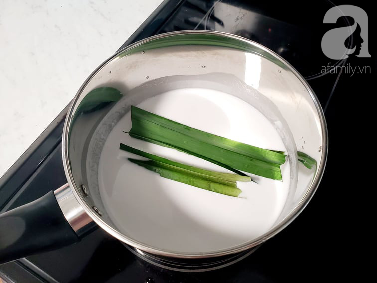 Bước 5: Cho 150ml nước cốt dừa cùng với 1 lít nước vào nồi, thêm đường và đun sôi. Trong quá trình đun luôn khuấy đều. Có thể thêm lá dứa cắt khúc vừa và gừng tươi bỏ vỏ thái lát vào đun sôi. Tiếp đến hoà 50g bột năng còn lại với một chút nước. Khi nước cốt dừa sôi, bạn hãy cho hỗn hợp bột năng đã pha vào và khuấy đều đến khi hỗn hợp sánh.