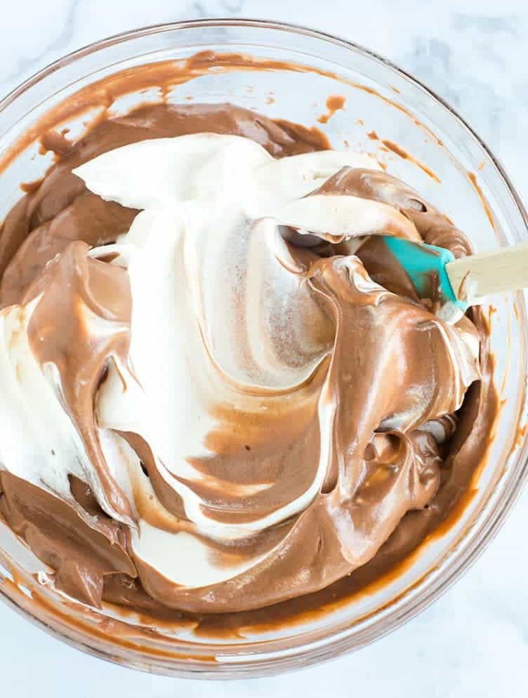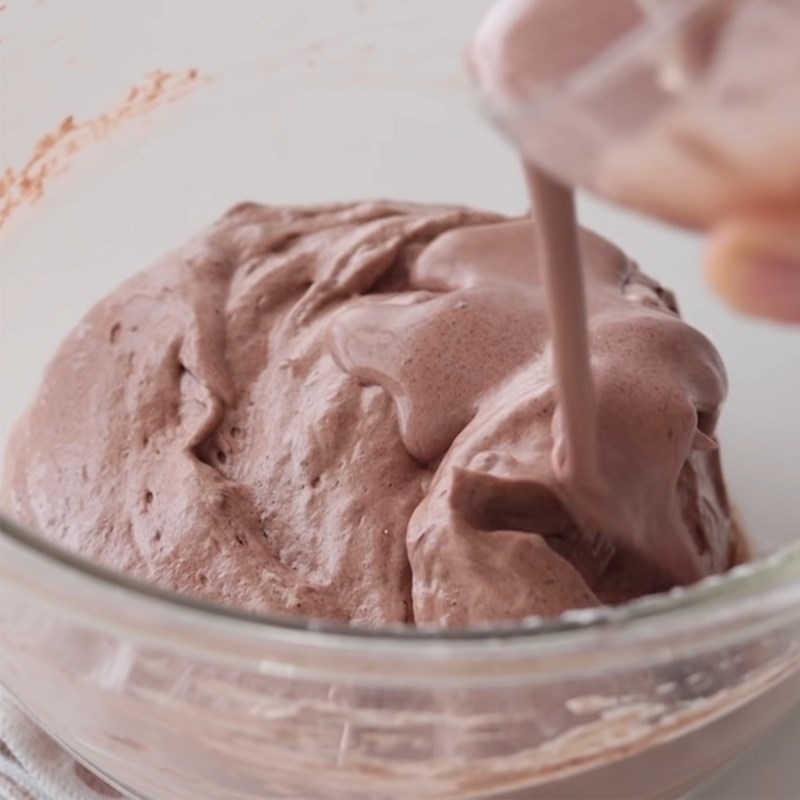 • Sau khi đánh bông phần kem, trộn từng phần kem tươi vào hỗn hợp chocolate. Trộn từ từ, đến khi hỗn hợp hòa quyện, mịn là được.