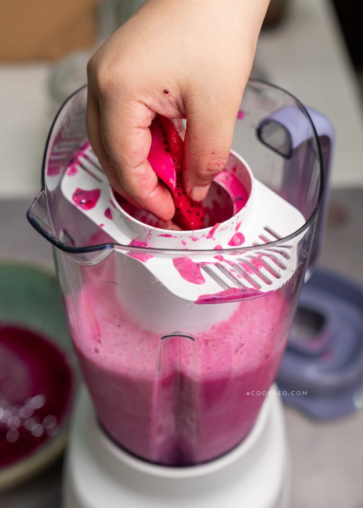 Bước 2: Cho thanh long, sữa đặc, sữa tươi, nước cốt chanh vào máy xay sinh tố, xay nhuyễn.