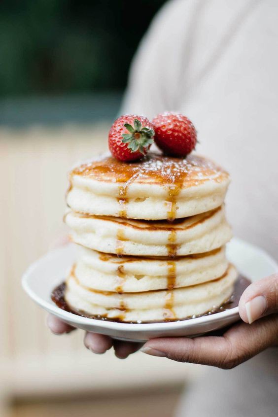 - Pancake ngon nhất là ăn khi còn nóng ấm. Thường mình thấy mọi người hay ăn với maple syup. Nhưng cả nhà có thể thay bằng bơ và mật ong, mứt quả hoặc các loại hoa quả tươi, hoặc hoa quả sốt bơ caramel.