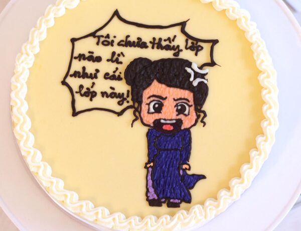 Nếu các bạn nghĩ bánh phô mai thì chỉ có thể làm theo những mẫu truyền thống vậy thì các bạn sai rồi nhé. Ở Cheesecake Ngon bạn có thể yêu cầu vẽ phát họa trên bánh mà bạn muốn, chỉ cần gửi hình ảnh các bạn muốn vẽ thì quán sẽ cho bạn chiếc bánh xinh xinh kiểu chibi như thế này.