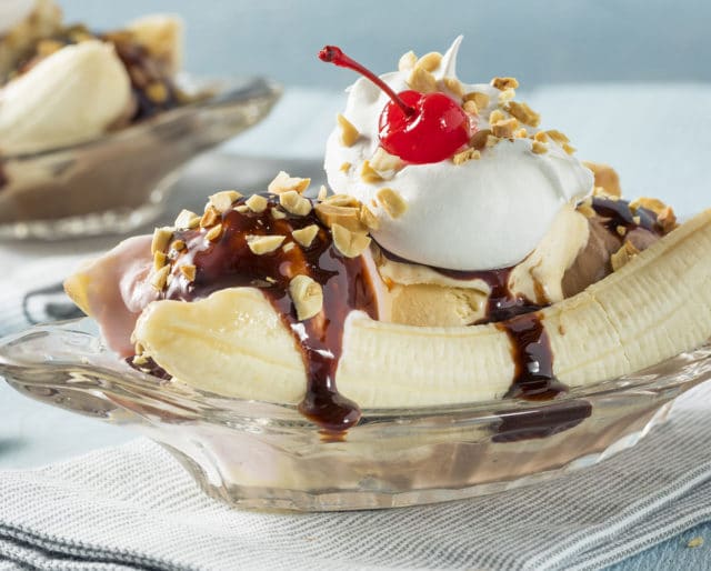 Là một món tráng miệng làm từ kem. Banana Split dạng cổ điển được phục vụ trong một hình dạng như một chiếc thuyền dài, gồm quả chuối tươi cắt theo chiều dài rồi trưng bày ra đĩa. Thêm một vài viên kem vanila, chocolate, dâu tây đặt trên giữa quả chuối được tách đôi. Có nhiều loại sốt khác nhau được phủ lên kem và được trang trí bằng các loại hạt nghiền, kem tươi, hoặc cherry maraschino.