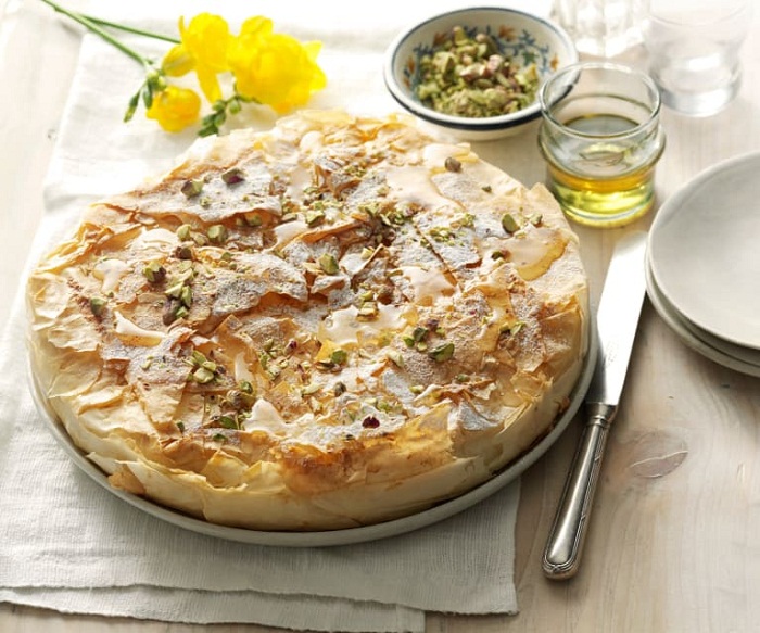 Món tráng miệng Hy Lạp này bao gồm nhiều lớp phyllo được rắc bơ tan chảy, khi nướng sẽ có màu vàng bắt mắt trên mặt. Bánh được kết hợp với sữa trứng semolina nhẹ nhàng. Từng miếng nhỏ được xắt ra cộng thêm với hương bột quế thơm lừng nhất là khi mới vừa được nướng xong. Món ăn cổ điển Hy Lạp này thường được tìm thấy trong các cửa hàng bánh ngọt và quán rượu truyền thống trên khắp đất nước.