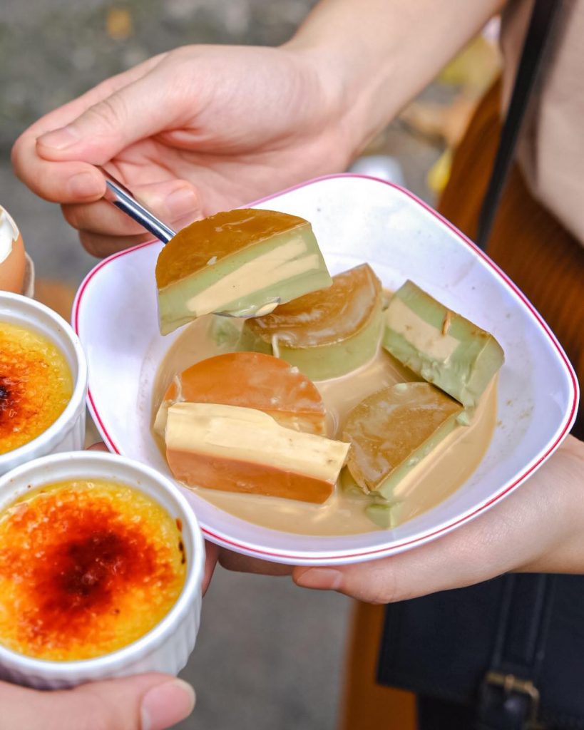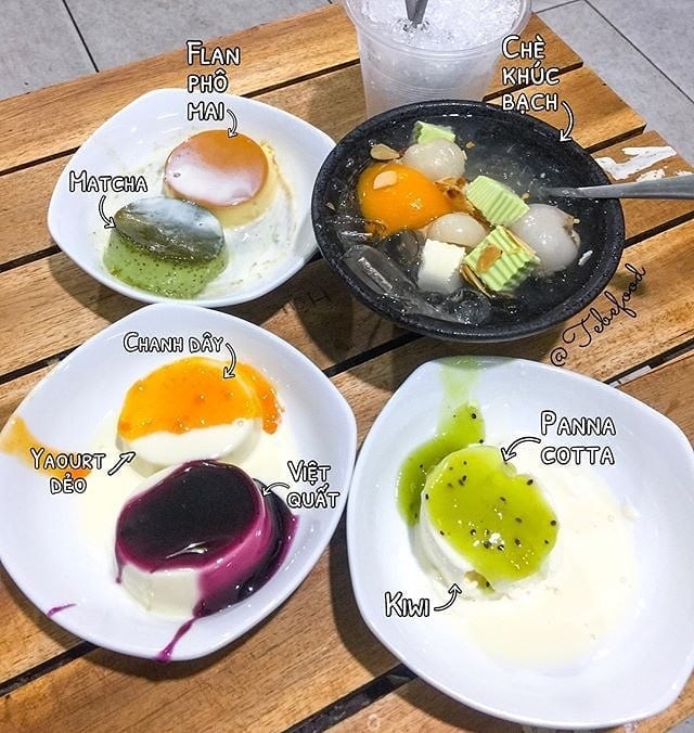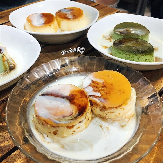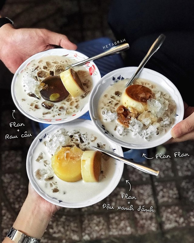 Menu của quán vô cùng đa dạng tuy nhiên bánh flan truyền thống và bánh flan trà xanh là hai ứng cử viên sáng giá để bạn chọn lựa khi dừng chân tại địa điểm này. Bánh flan rất thơm, có vị ngọt vừa vặn thêm chút đá mát lạnh, chút cà phê kết hợp cùng bánh flan để thưởng thức thi rất hào quyện. Quán nổi tiếng đã lâu nên vô cùng đông đúc tuy nhiên yếu tố nhanh chóng vẫn được đảm bảo.