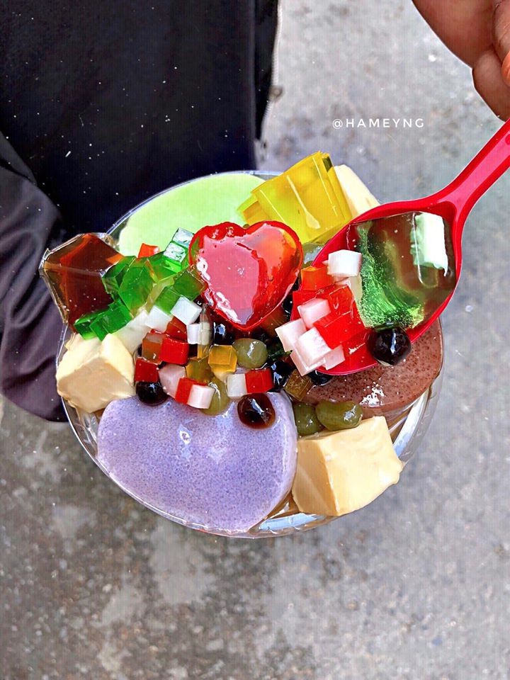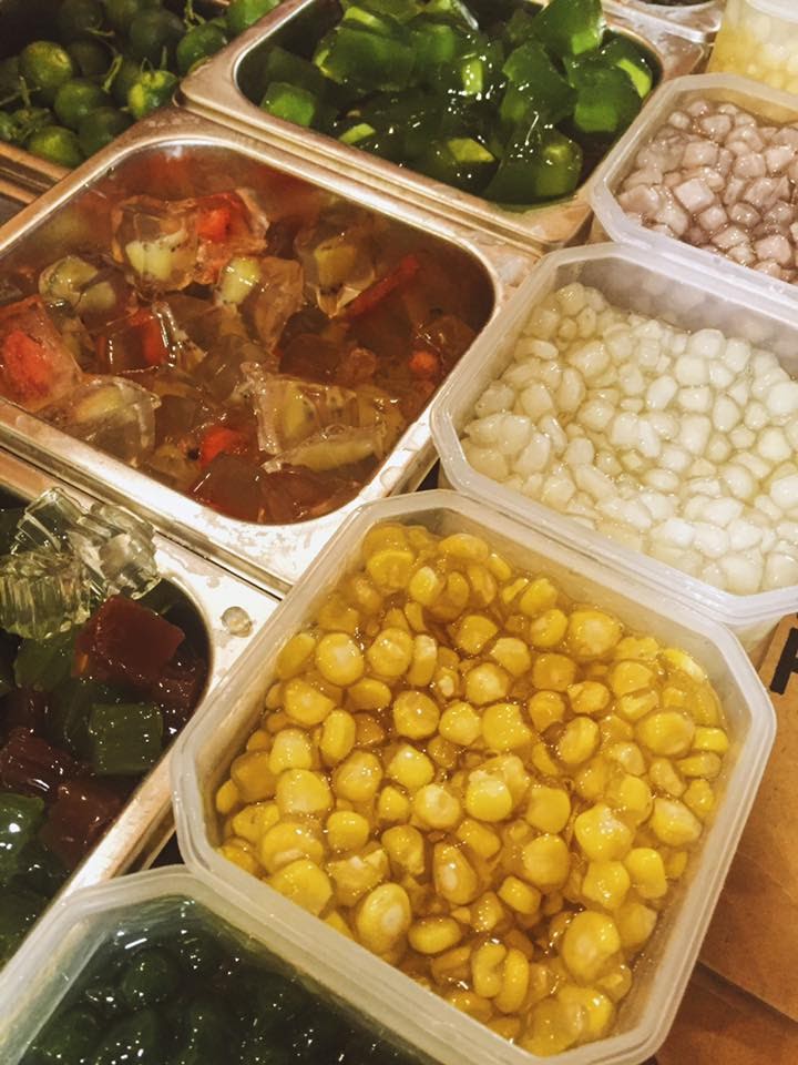 Không phải quán xá cầu kì, chỉ là hàng trà sữa bé bé được gộp từ 2 chiếc bàn, trên đó là những chiếc hộp topping hấp dẫn. Vậy thôi mà chiều nào tan học cũng đông đúc tấp nập các bạn sinh viên. Ở đây, các loại trân châu đa dạng được quảng cáo là toàn tự làm như: trân châu socola, trà xanh, bắp, khoai môn, trân châu phômai béo, dai dai sựt sựt lại béo ngậy,…