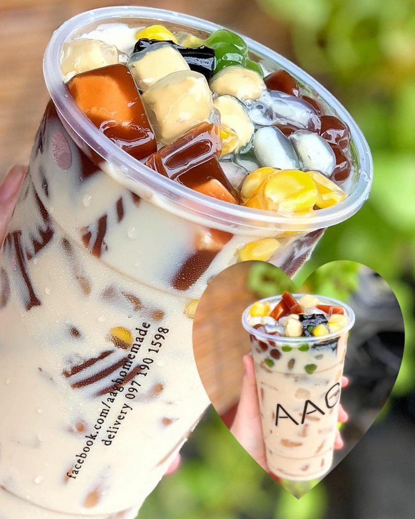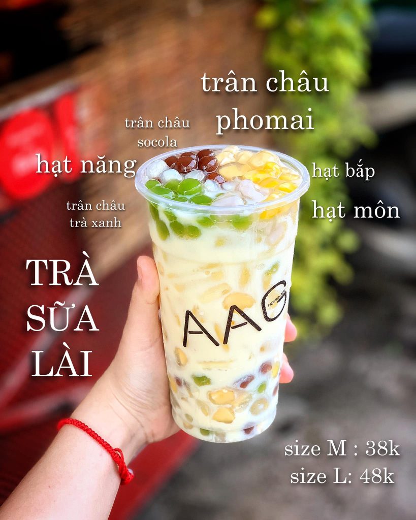 Trà sữa AAG luôn chọn những nguyên liệu có xuất xứ rõ ràng, chất lượng nhất để đảm bảo an toàn cho khách hàng. Trà sữa không quá béo, thơm mùi trà nhẹ nhàng, khi thưởng thức vô cùng dễ chịu. Không chỉ chăm chút phần topping, thức uống của AAG cũng được pha chế rất hợp khẩu vị, độ ngọt vừa phải là điểm cộng của quán. Ngoài ra còn có trân châu đen, thạch của năng, hạt bắp,… Nếu như bạn nào muốn vừa uống trà sữa vừa được ăn nhiều loại topping hấp dẫn thì có thể chọn trà sữa thập cẩm để có thể tận hưởng hương vị này.