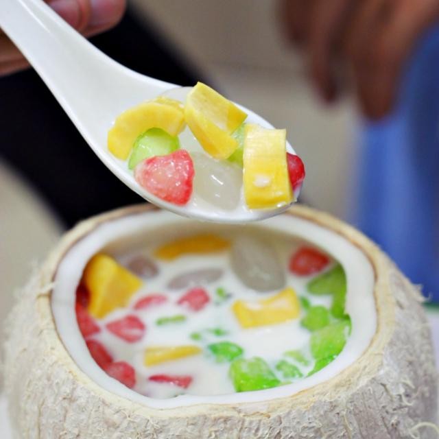 Cũ năng giòn được áo qua lớp bột củ năng dai dai mềm mềm nhai sồng sột trong miệng. Được đựng trong trái dừa to đùng, bên trong có những lát dừa non bào sợi mềm thơm khó tả. Ngoài ra còn có mít, dâu tây và các loại trái khác. Ăn với đá bào mùa hè thì khỏi bàn cãi, cái nóng nào cũng bị đánh bay đi.