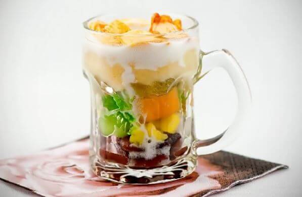 Những viên thạch trái cậy đủ màu sắc xanh, đỏ vàng trong vô cùng hấp dẫn. Món chè này rất thích hợp cho những ngày nắng nóng ở Sài Gòn, bạn thèm cái gì đó mát lạnh, ngọt thanh để cung cấp lại nguồn năng lượng cho cơ thể. Thạch thường được làm từ nhưng loại trái cây như: nho, dưa hấu, xoài, dâu, việt quất… phủ bên ngoài là lớp rau câu giòn. Thường được ăn kèm với bánh flan, nước cốt dừa và đá bào.