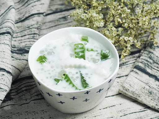 Món chè được chế biến từ cơm dừa còn non cắt miếng nhỏ, dừa mềm, béo, kết hợp với thạch lá dứa thơm giòn. Ngoài ra còn có bột báng, nước cốt dừa- nguyên liệu không thể thiếu cho các món chè Việt Nam.