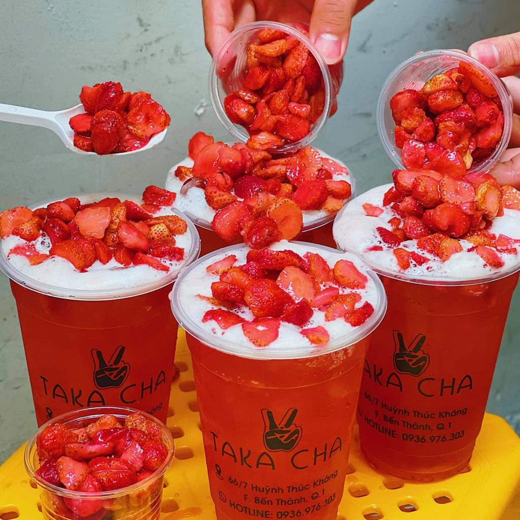 Đừng nhìn vì bạn sẽ bị “ thèm “ mất, đó là khi bạn đến với những ly trà dâu đỏ mọng trứ danh nhà Taka Cha. Cái chua chua ngọt ngọt của dâu tươi đã lên men với mức độ vừa phải cộng với vị “ đằm “ nhẹ của trà sẽ làm bạn hút “ ừng ực “ để “ đập tan “ cơn khát mùa hè đã làm nên thương hiệu trà dâu nức tiếng Sài Gòn.Ngoài ra bạn còn có thể gọi thêm nhiều loại topping nhà làm khác tại quán cũng khá ấn tượng như pudding, bánh flan hay trân châu,…Taka Cha sẽ thích hợp cho những ai thích không gian lề đường thoáng mát, bình dân hoặc bạn có thể mua mang về ( sẽ phải xếp hàng ở những giờ cao điểm ) để có cho mình ly nước với giá bình dân nhưng chất lượng trên cả bình thường.