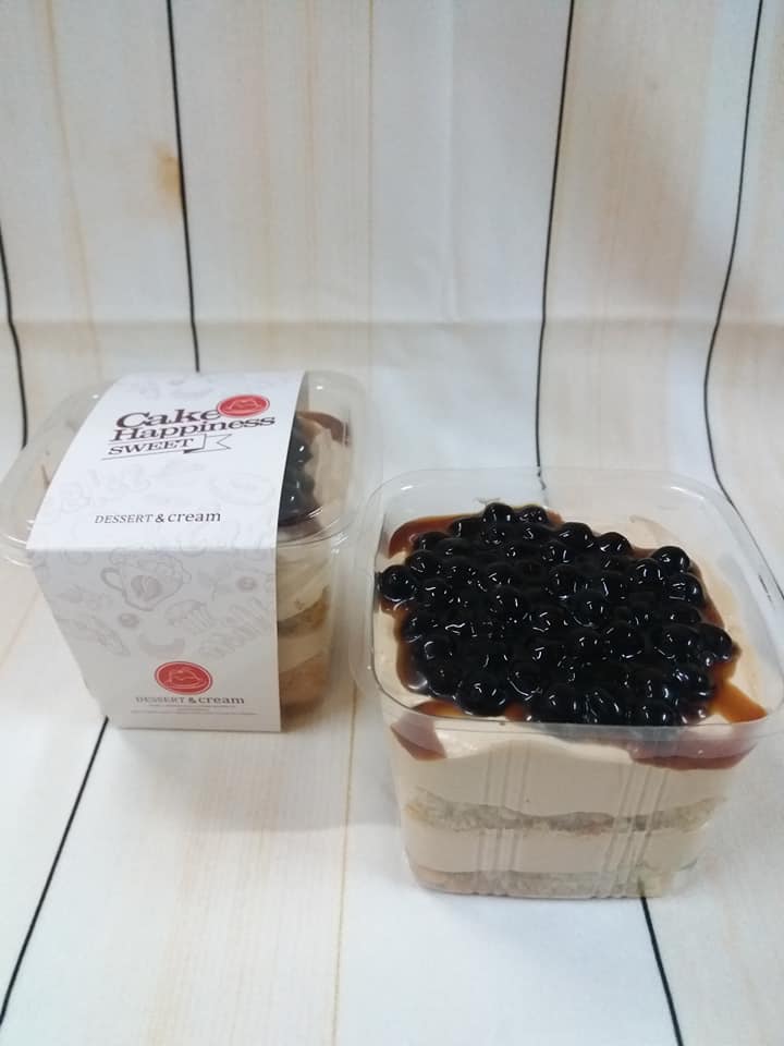 Bánh kem mousse trà sữa, bông lan hương trà thái, milk foam, trân châu đường đen, đậm vị trà, béo bị sữa.
